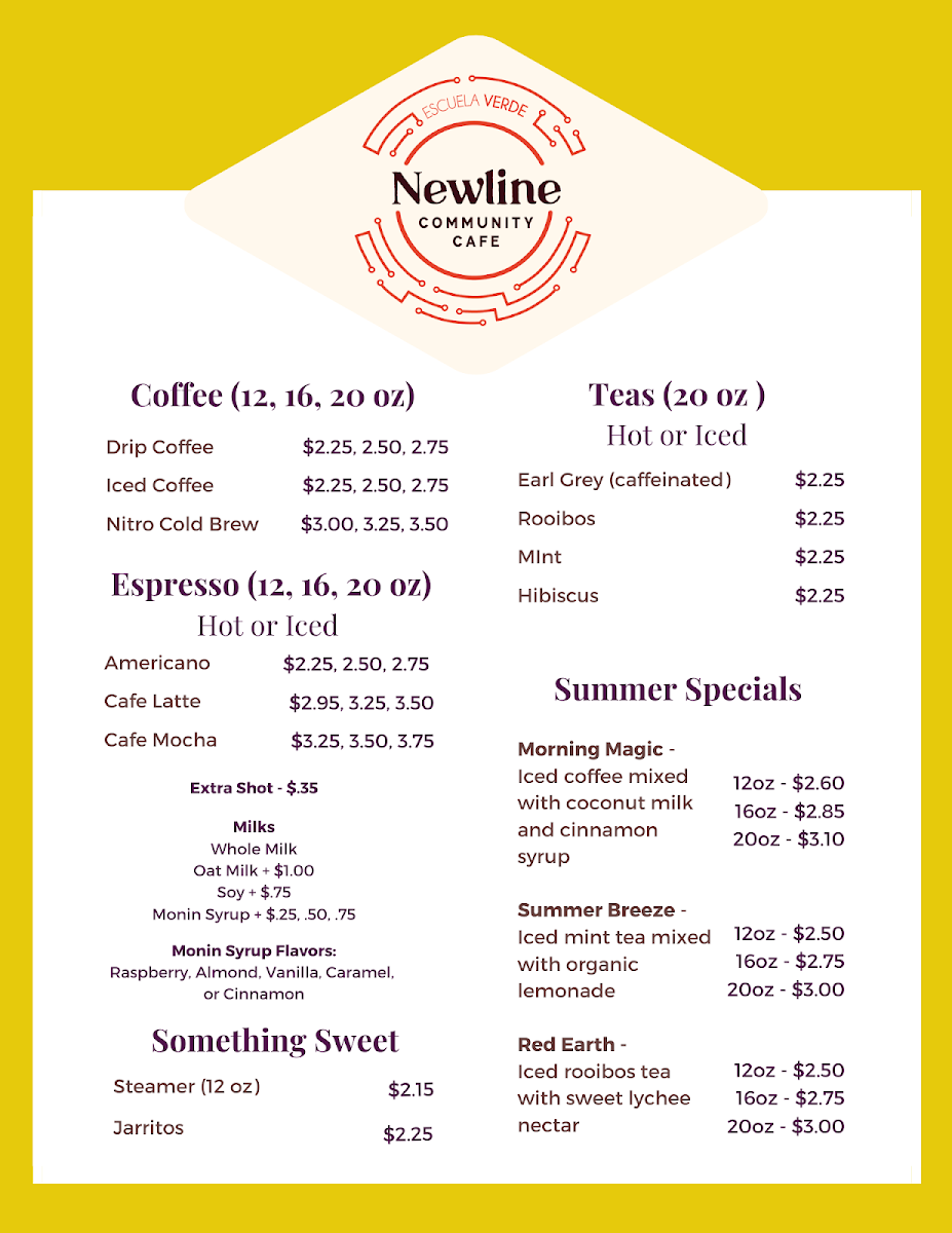 Escuela Verde's Newline Community Cafe Menu
